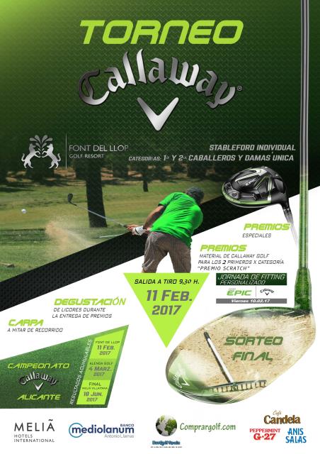 El próximo sábado 11 de Febrero con salida a tiro a las 9.30 en la modalidad individual Stableford tendrá lugar en Font del Llop el VI Torneo Callaway que como todos los años traerá una cantidad enorme de premios para los participantes. Carpa a los 9 hoyos para disfrutar del picnic y una comida al finalizar con degustación de productos de los patrocinadores. Con dos catagorías masculinas y una femenina y campeón Scrath 5 premios especiales hará que sea como todos los años referente en los eventos anuales en Font del Llop.