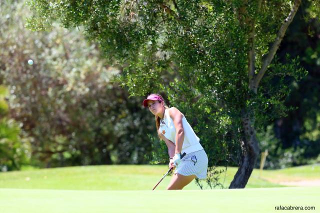Entre las españolas, Luna Sobrón y Nuria Iturrios reposan brillantemente en la tercera plaza mediante vías bien distintas. Mientras que la primera se abrazó a una regularidad –un birdie y un bogey hasta el hoyo 11– rota felizmente en los últimos hoyos, donde concretó tres birdies gloriosos, la segunda convirtió su vuelta en un auténtico tobogán repleto de espectaculares subidas y bajadas. Seis birdies, dos bogeys y un doble bogey resumen un juego sin concesiones que brota del alma.
